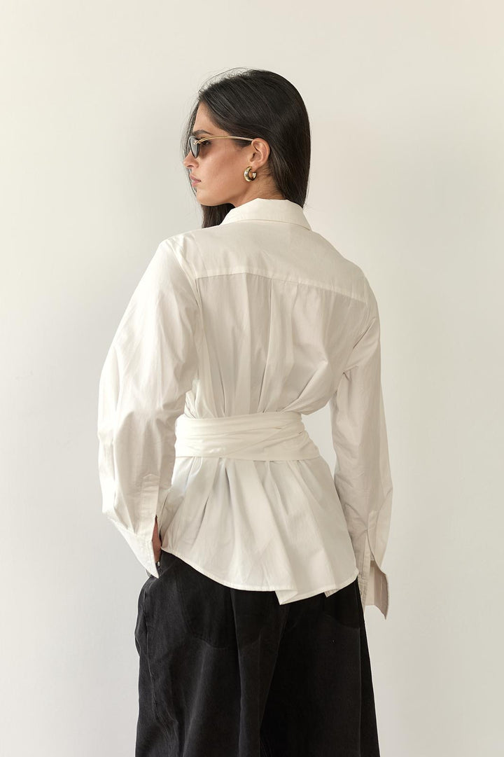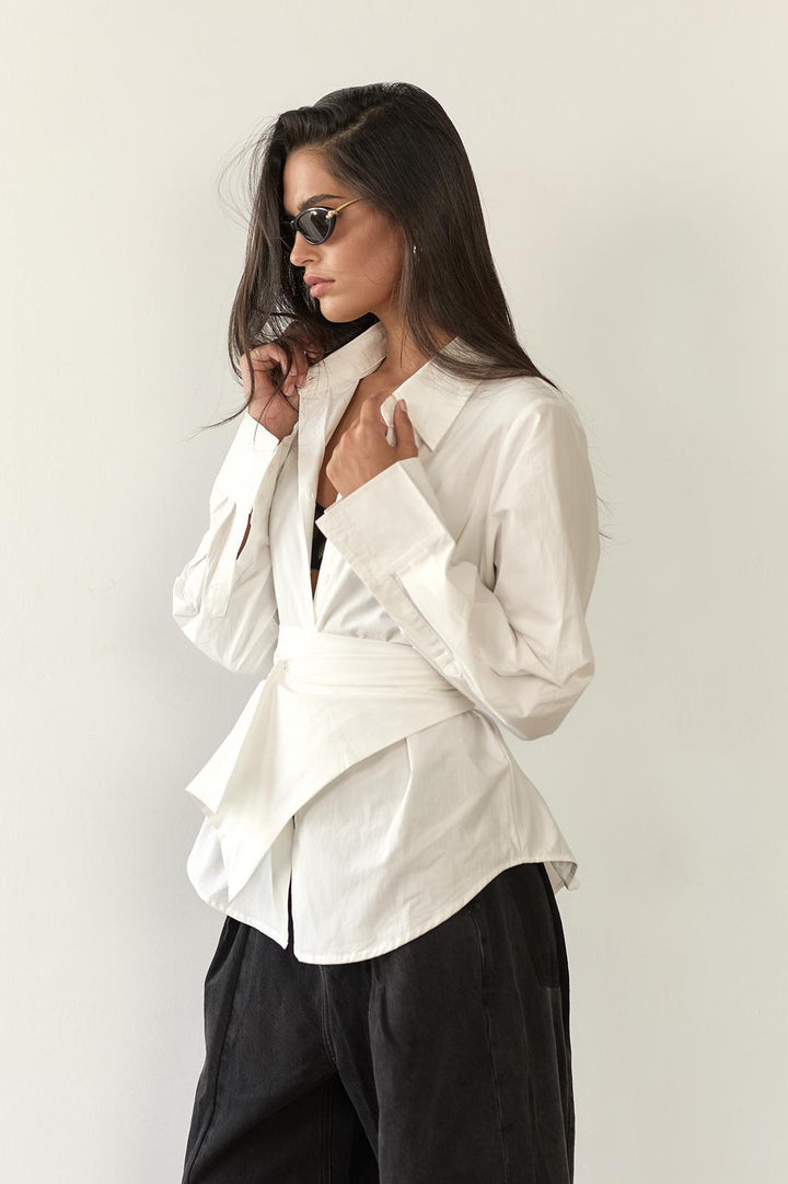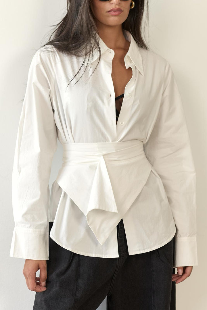 החולצה מכופתרת עם טוויסט אלגנטי ועיטור של אפשרות לקשירה המוסיפה מראה מודרני ומתוחכם.