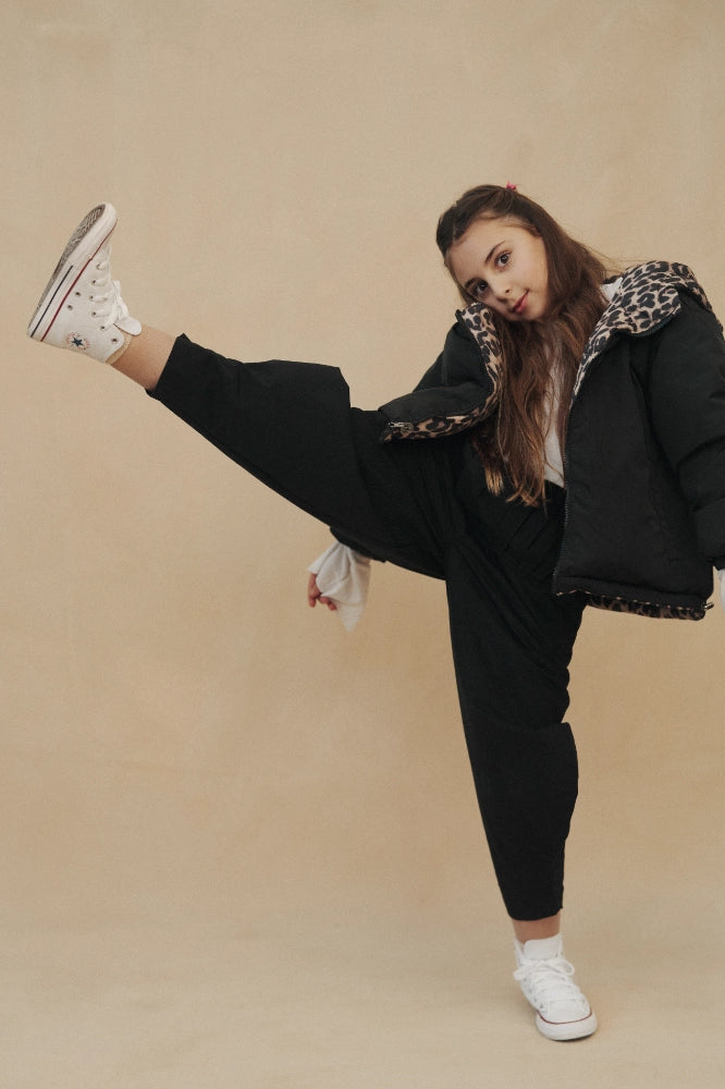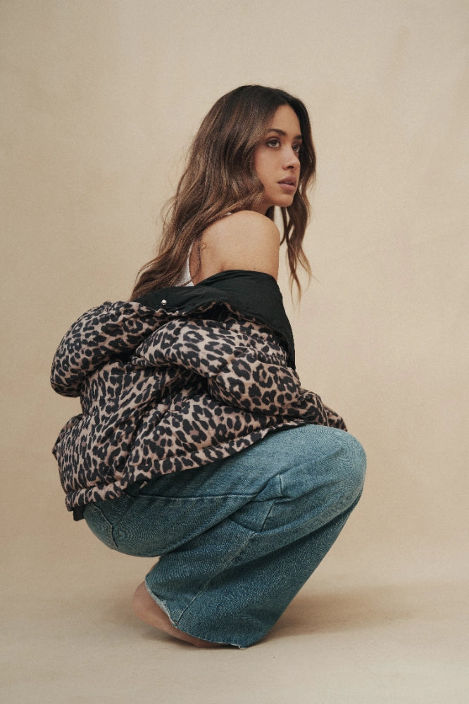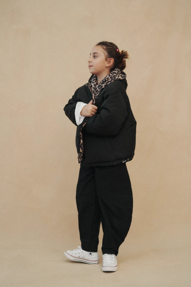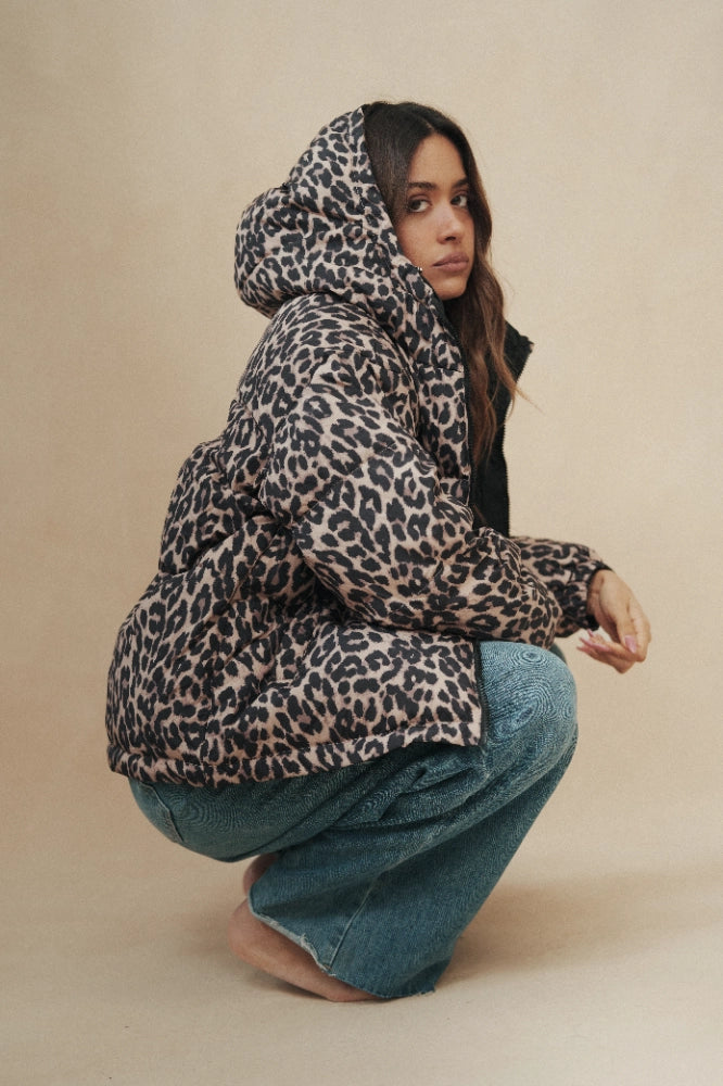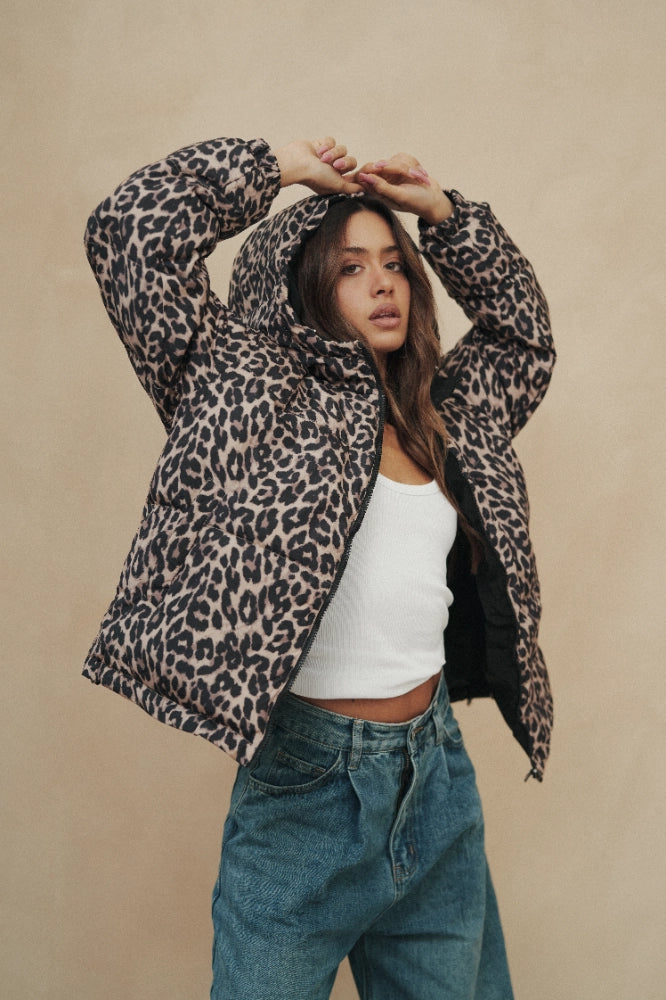 מעיל פוך דו צדדי ומחמם במיוחד במילוי נוצות אווז.בצידו האחד פרינט מנומר ובצד השני שחור חלק ורך,המעיל עשוי 100% פוליאסטר,עם כובע ו2 כיסים משני צדדיו. המעיל נסגר ברוכסן ולוגו לב המותג רקום על תווית בצד השחור חלק.